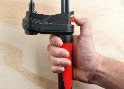 Mit der neuen Getriebezwinge sind Spannarbeiten auch auf engstem Raum möglich. Ermöglicht wird dies, da die Spindel vom Griff getrennt und um die Schiene herum platziert wurde. Von dort ausgehend wird mit jedem Dreh die Spannkraft über eine im Gleitbügel verborgene Mechanik auf die Spindel übertragen. Im Vergleich zu klassischen Schraub- oder Einhandzwingen ist die Getriebezwinge wesentlich kompakter.