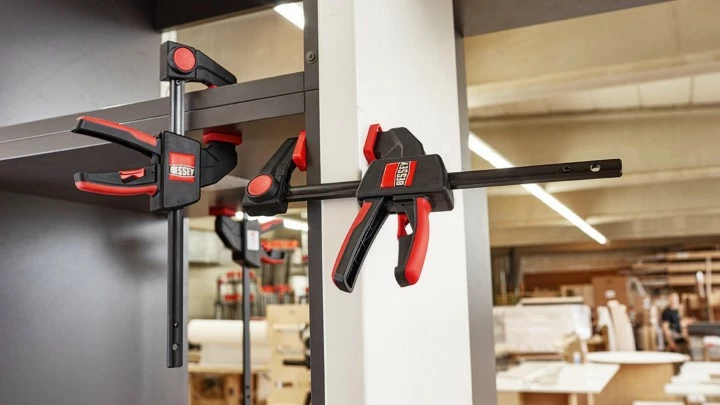 Diese Einhandzwinge aus dem Hause Bessey stellt ein ideales Werkzeug für Spann- und Spreizarbeiten dar, wenn die zweite Hand freibleiben soll.