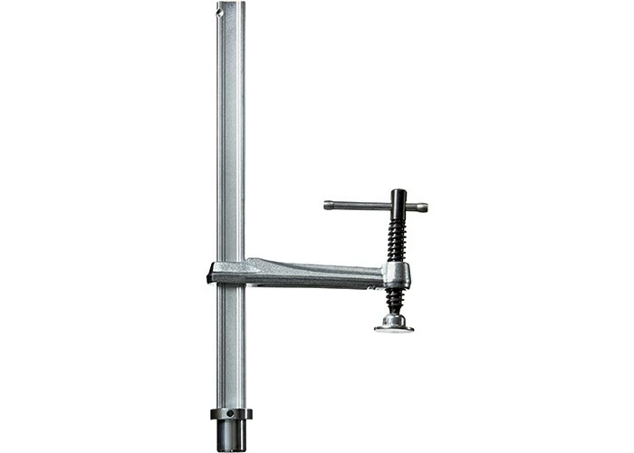- Hochwertiger Knebelgriff mit abgerundeten Enden. Leichtgängige Trapezgewindespindel und werkzeuglos wechselbarer Druckplatte
