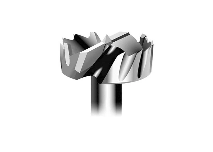 - HM-bestückter Forstnerbohrer mit Zentrierspitze, HM-Hauptschneide und HM-bestückter, gezahnter Umfangschneide in Wellenform