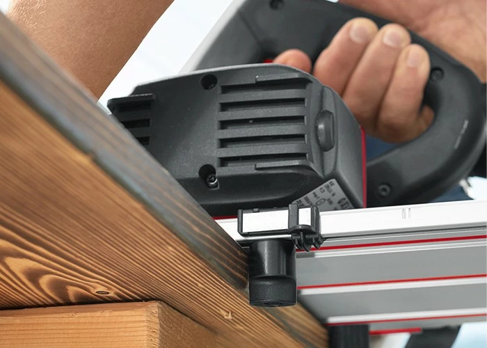 - Feste Verbindung durch Schnellverschluss von Handkreissäge mit KSS-Kappschiene. Der Rückholzug bringt die KSS60 18M bl nach jedem Schnitt wieder in die Ausgangsposition zurück